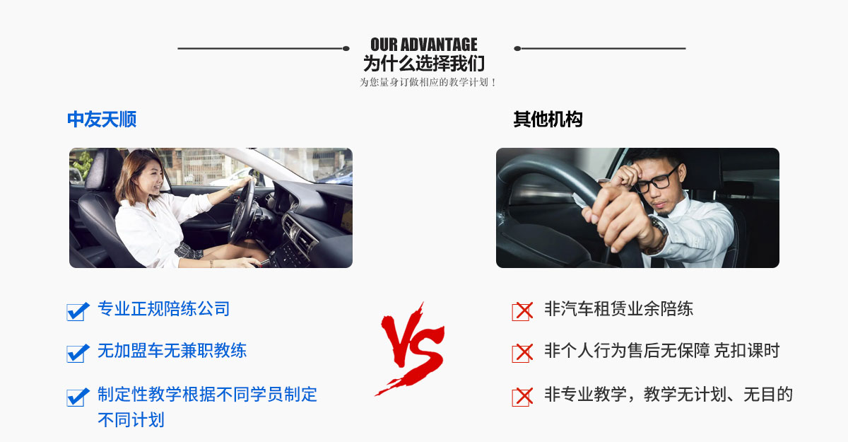 北京中友天順汽車陪練隸屬于北京中友天順汽車技術有限公司一家專業的汽車陪練公司,公司秉承宗旨:為已有駕駛本而不能夠在實際道路上安全行駛的駕駛員而服務的,我們大力宣揚道路安全駕駛理念,深度提高駕駛員駕駛技術,為首都駕駛員的安全駕駛技術和安全駕駛意識服務.從而減少首都道路的涌堵,減少首都交通事故的發生。針對不同開車基礎的學員制定各種培訓方案!誠信、專業、周到!北京中友天順汽車陪練公司全部為部隊轉業軍人,駕齡都在十五年以上, 曾在部隊任職教練工作多年,又經專業培訓上崗,教學多年,經驗豐富,耐心細致,服務規范!針對不同程度的學員駕駛技術特設培訓班,保證能使每個練車學員在最短的時間內學到真正的駕駛技能,能夠安全獨立駕駛車輛?! ×磲槍δ懶【o張、技術偏差、多年不動車零基礎學員,特設技術培訓班!